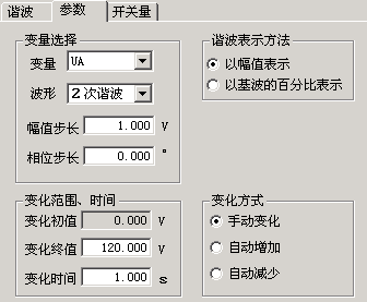 幅值步長:這里的步長也與“諧波表示方法”相對應(yīng)。當(dāng)選擇“以幅值表示”時,步長也以幅值表示,單位是A或V;而選擇“以基波的百分比表示”時,則步長也是百分比。