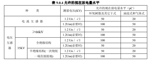 5.局部放電測量的測量電壓及視在放電量應(yīng)滿足表 9.0.4 中數(shù)據(jù)的規(guī)定。